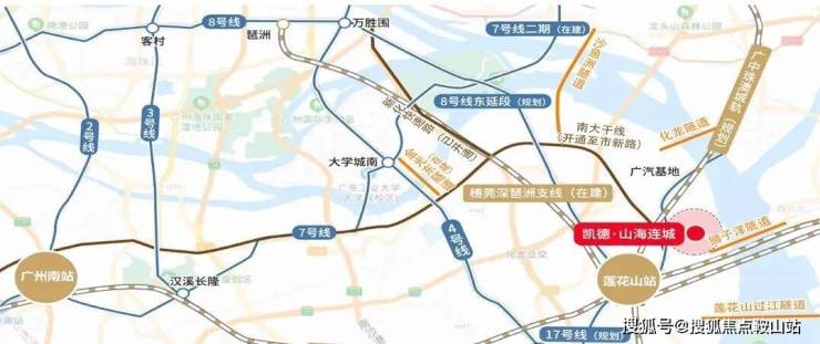 莲花湾板块,属于番禺东石楼镇,整体发展缓慢,配套不齐全,得益于南大干线的开通,缩短了到市区的距离,开车出行非常方便,比如到琶洲30分钟左右,还有规划地铁8号线东延段,但是也要3-4公里,跟17号线,还有两条城轨,一条高铁,打造所谓的五轨交汇的莲花湾TOD,不过都是需要时间兑现,哪怕建好都是不近现在在售的楼盘,也要2-3公里。