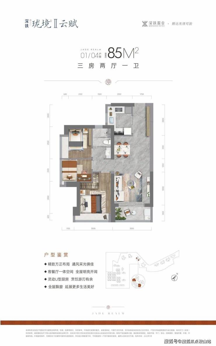 85㎡的3房2厅1卫,设计的是竖厅格局,进门入户玄关,客厅3.6米开间,LDKB一体化设计,动静分区,U型厨房,卫生间三段式分离,得房率约75.4%(不含赠送),西南或东南朝向。