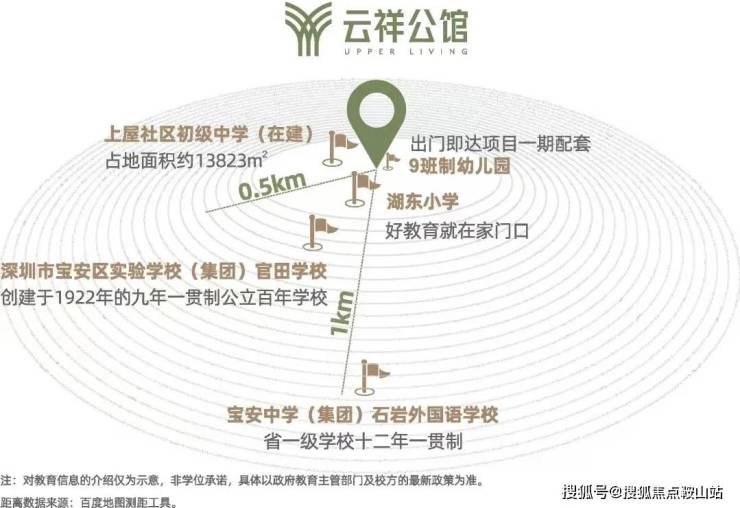 在教育方面,一期自带幼儿园,且临石岩湖东小学,一路之隔即上屋初级中学(在建),约500m可达官田学校,约1km可达宝安中学(集团)石岩外国语学校。