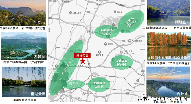 白云山、南湖景区、天鹿湖、帽峰山、六片山、龙洞生态景区六大生态景区四面环绕