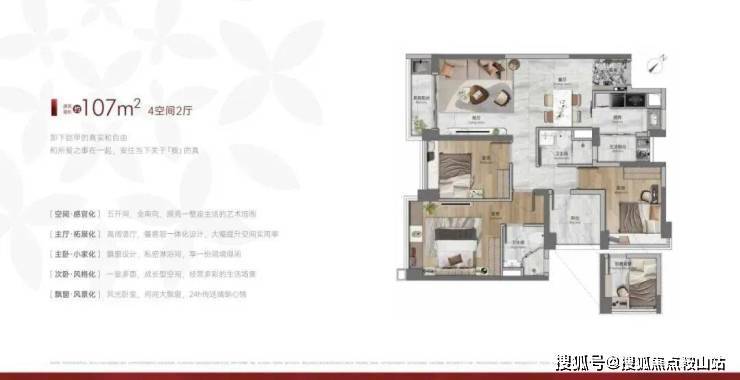 建面107平四房两卫,五开间朝南,经典竖厅设计,餐客厅一体化,每间房都有赠送大飘窗