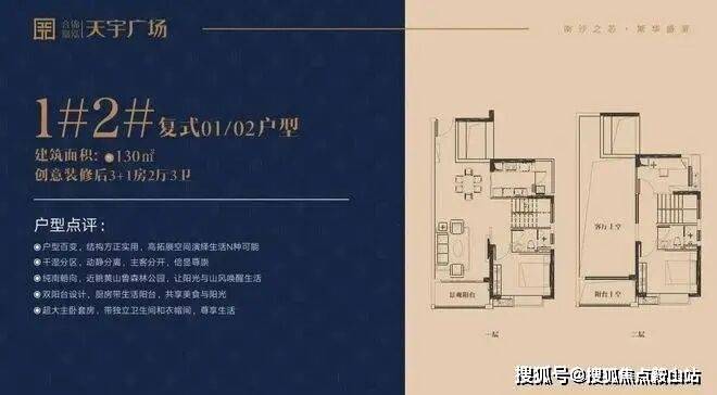 复式建面约133㎡四房两厅三卫,主要集中分布在1栋2栋的01/02单元,纯南向设计,居住舒服度绝对没得比,先赠送超大入户花园,进门后方正餐客厅连接阳台,纯南朝向,近眺黄山鲁森林公园,让阳光与山风唤醒生活。