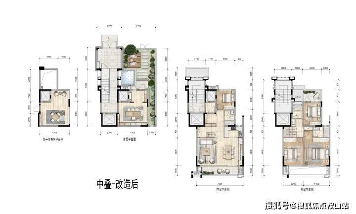 一层北向约35㎡花园及一间会客厅,四层餐客厅厨房及1间卧室,三层是休息区共有3间卧室。