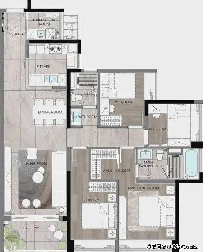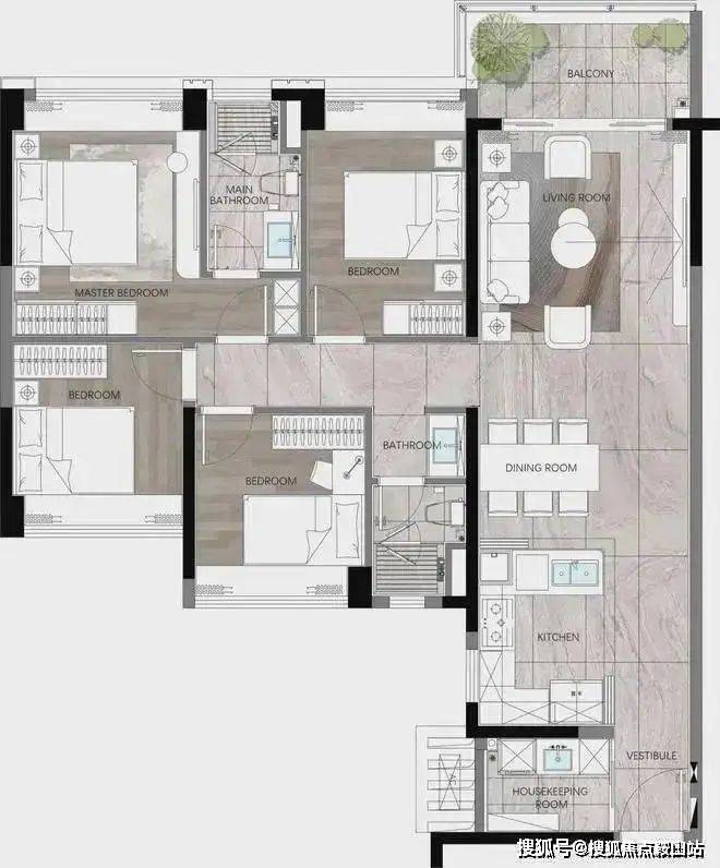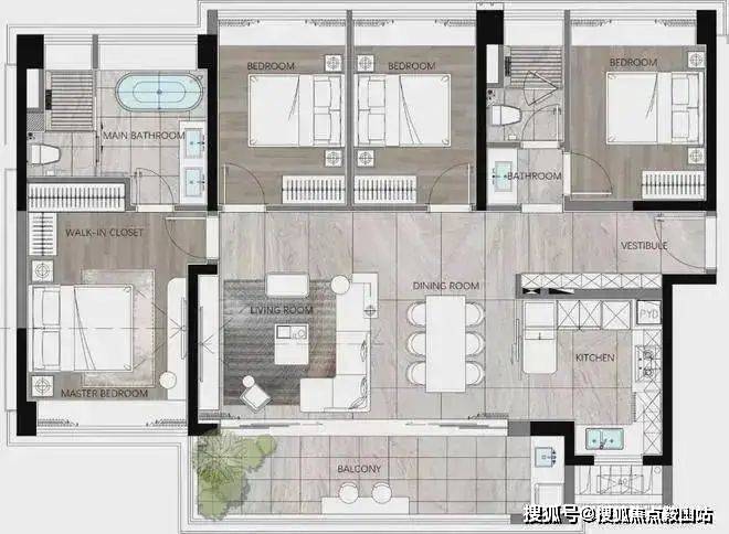 :宽敞明亮,居住与生活动静分离,南向大阳台或南北双阳台,主卧带 270° 飘窗。
