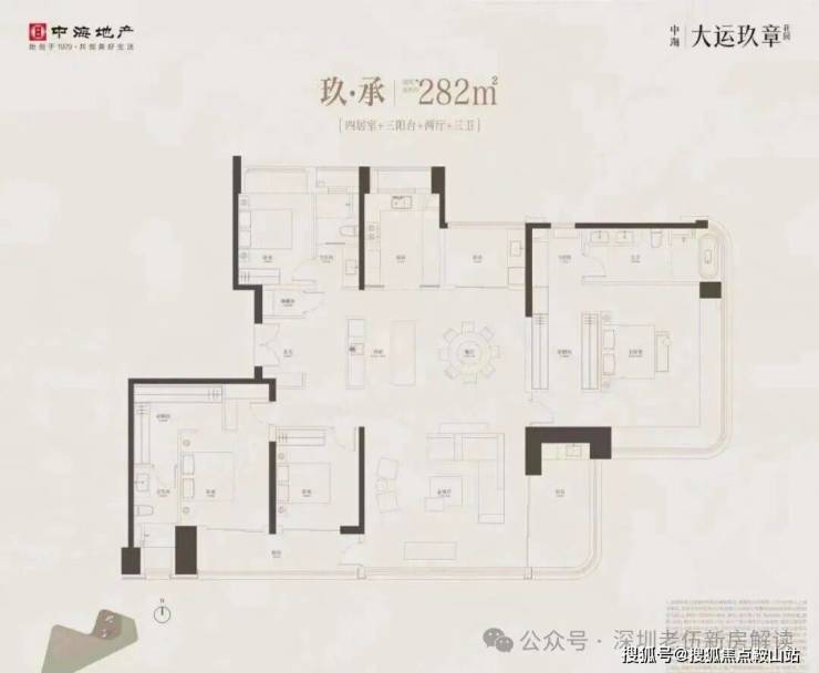282m²的4房2厅3卫3阳台,设计的是竖厅格局,客厅6.2米开间,LDKB大方厅设计,2梯2户,尊享专梯专户,私享超大入户公区,五开间朝南,主卧270°无柱转角飘窗,双套房设计均配置衣帽间,中西双厨房,主卫配置浴缸,得房率约90.6%(包含赠送),不含电梯入户,南北双阳台,小阳台看大运公园山景,大阳台东南朝向,俯瞰整个大运中心。