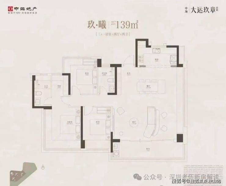 139m²的4房2厅2卫,设计的是竖厅方正大面宽格局,进门入户玄关,客厅7米开间,LDKB一体化设计,超大客厅+餐厅位,还有东北侧超大飘窗景观面,动静分区,三开间朝南,主卧做到了270度转角无柱飘窗,U型厨房,卫生间干湿分离,