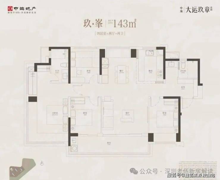 143m²的4房2厅2卫,设计的是竖厅南北通透格局,进门入户玄关,客厅4.5米开间,餐客厅分离设计,四开间朝南,全屋七面飘窗,主卧大套间做到了270度转角无柱飘窗,U型厨房,公卫三段式干湿分离,得房率约92.2%(包含赠送),客厅连接次卧出7.4米长的观景大阳台,全部主朝东南向,看大运中心+大运公园景观。