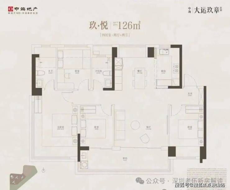 126m²的4房2厅2卫,设计的是竖厅南北通透格局,进门入户玄关,客厅4.3米开间,餐客厅分离设计,四开间朝南,全屋八面飘窗,主卧做到了270度转角无柱飘窗,U型厨房,卫生间干湿分离,得房率约95.2%(包含赠送),客厅连接次卧出7.1米长的观景大阳台,全部主朝西南向,看大运公园景观。