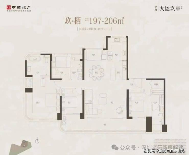 197-206m²的4房2厅3卫2阳台,设计的是竖厅格局,客厅6.1米开间,LDKB大方厅设计,2梯2户,尊享专梯专户,私享入户公区,进门配置储物间,五开间朝南,主卧270°无柱转角飘窗,双套房设计,中西双厨房,主卫配置浴缸,得房率约94.6%(包含赠送),不含电梯入户,南北双阳台,小阳台看大运公园山景,客厅连接2个次卧出超大观景大阳台,东南朝向,俯瞰整个大运中心。