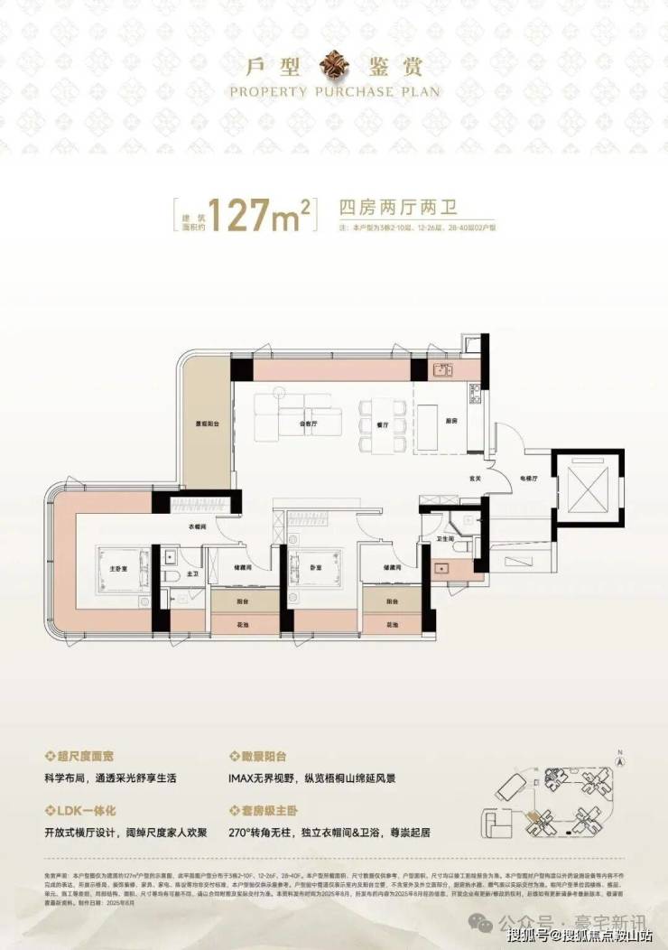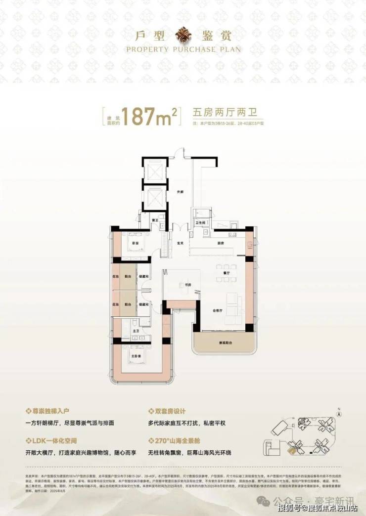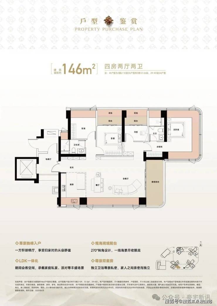 将地标高度/创新设计/极致景观/自然融合四大要素集于一体,约150米地标建筑以45°错位转体设计,实现四户分踞四角的独立瞰景布局,每户均可享有极致山海景观。约55米超宽楼间距、0.6的黄金窗墙比远超常规住宅0.3-0.5的标准,呈现山景、海景、花园三重景观界面。