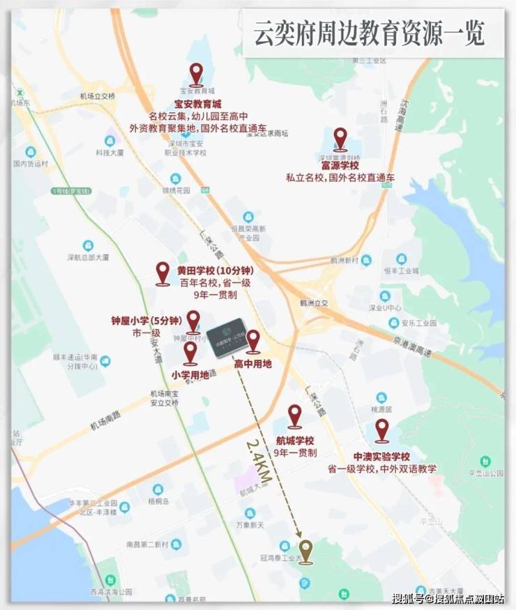 5分钟路程有钟屋小学,黄田学校;约3公里宝安教育城,东方英文书院,宝安第一外国语学校。