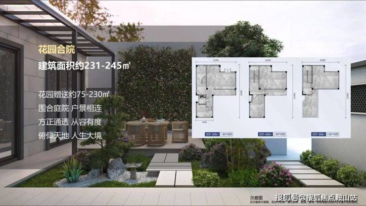 花园式企业合院:建筑面积约 231-245㎡ ,地上三层。(合院户型每套赠送 50-240 平米的大花园,20 平米的内庭院)