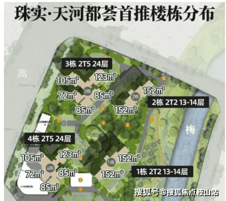 在寸土寸金的天河,高密度住宅早已成为常态。而珠江天河都荟却反其道而行之——项目整体容积率仅为2.0,是区域内极为少见的低密社区。首推北地块共4栋住宅,包含两栋13-14层的小高层(2梯2户)与两栋24层的高层(2梯5户),总户数仅284套,楼间距开阔,居住舒适度显著优于周边竞品。