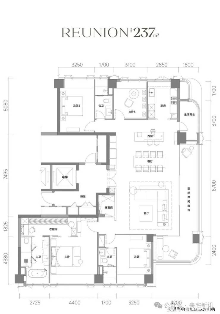 而建面约237m²户型,最大的亮点是其面积高达60m²、接近标准羽毛球场大小的LDKB全景家庭厅,以及一个长约18.9米、面积约31m²的L型270°拐角瞰景阳台。