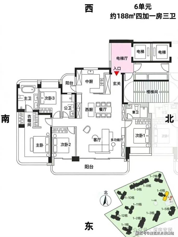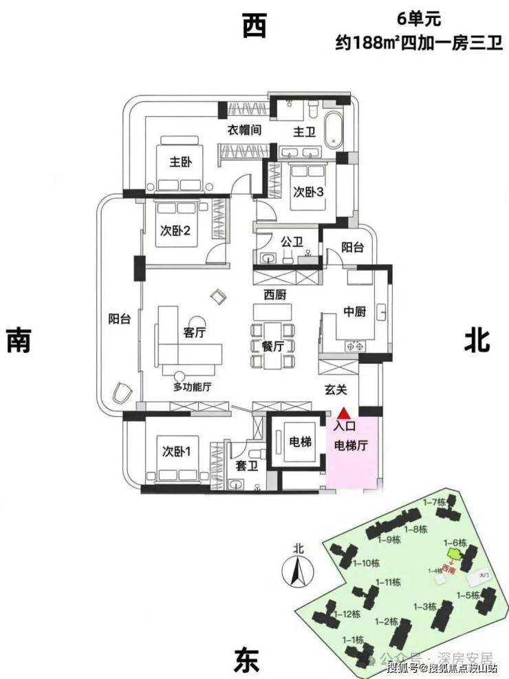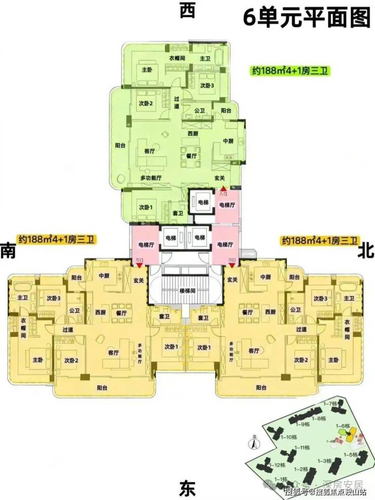 6单元:23层,3梯3户, 建面约188㎡