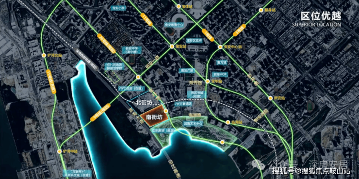 南街坊地块位于宝安中心区,紧邻沿江高速,坐拥湾区书城、湾区之光摩天轮、青少年宫、图书馆、滨海演艺中心、欢乐剧场等市级文化地标,与腾讯全球总部企鹅岛仅一水之隔。
