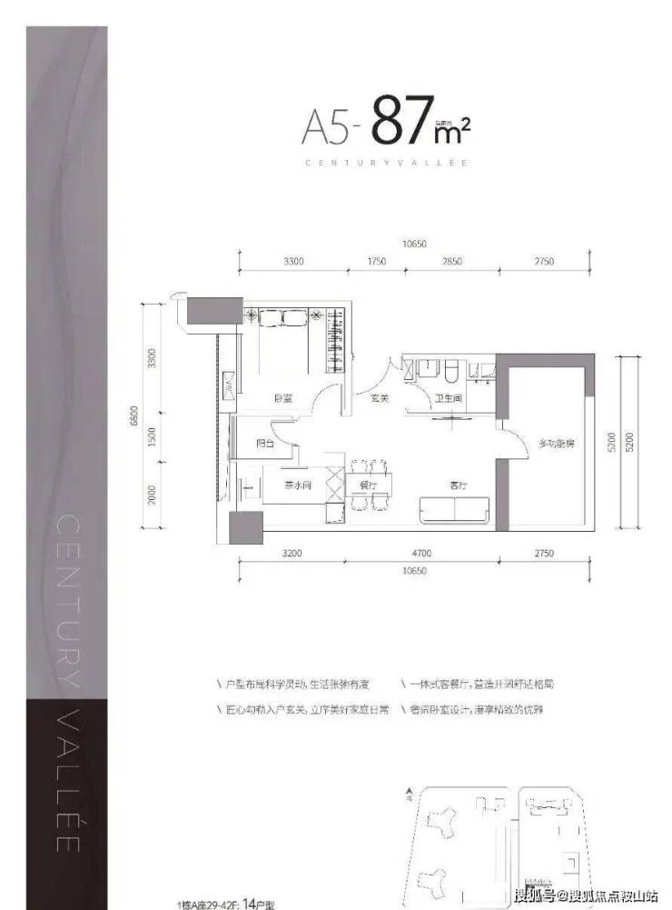 项目简介:总建筑面积约39万㎡,涵盖天际住宅、高端公寓、下沉式商业街等多种业态为一体,首推的1栋A座建面约67-87㎡天赋臻寓