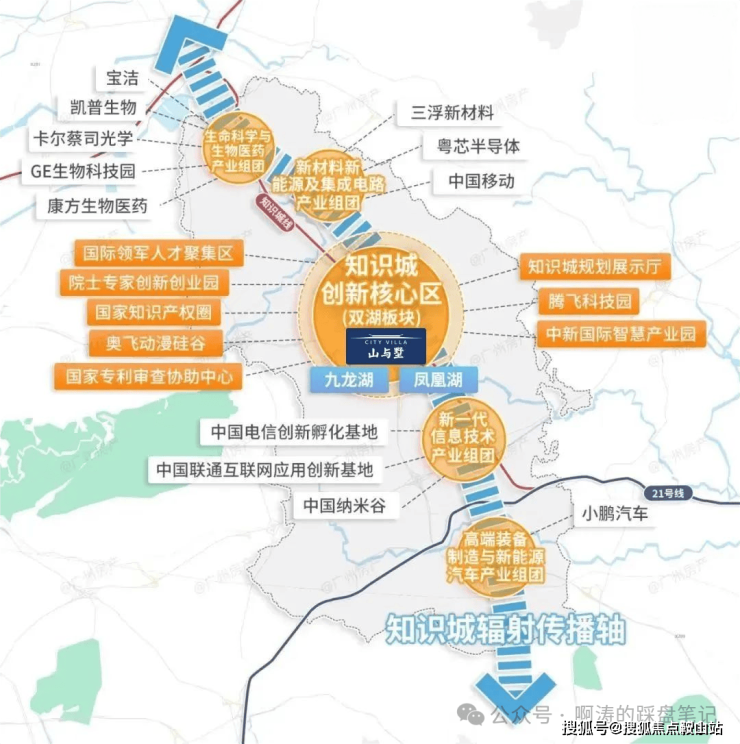 产业布局:投资数千亿,以“一核一轴四组团”布局已汇聚阿里巴巴、GE生物、西门子等全球500强高知经济龙头,粤芯、百济神州、百度Apollo等165个重大项目