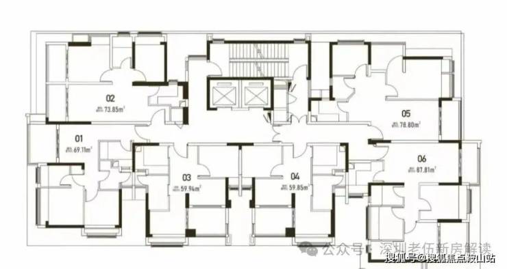 项目7-22层为住宅产品,可售商品房面积约59-89㎡ 2-3房,总房源共96套,2梯6户设计。