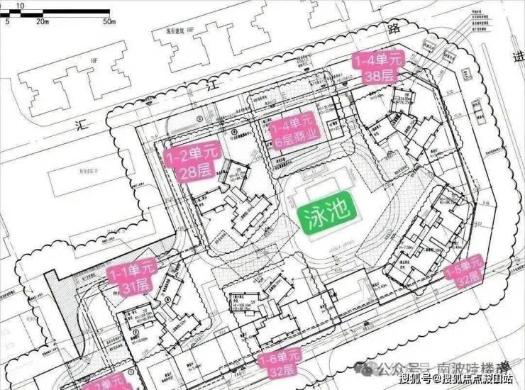 共规划建设7栋楼体,其中5栋为28-38层的高层住宅,共504户,均采用2梯4户或3梯4户的设计,另有1栋6层商业和1栋21层的办公产品,此外,小区内设有泳池配套。
