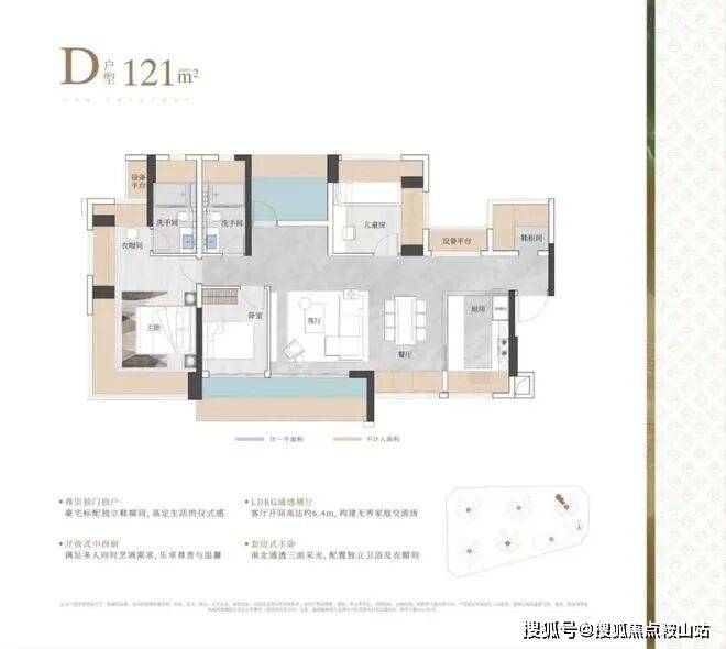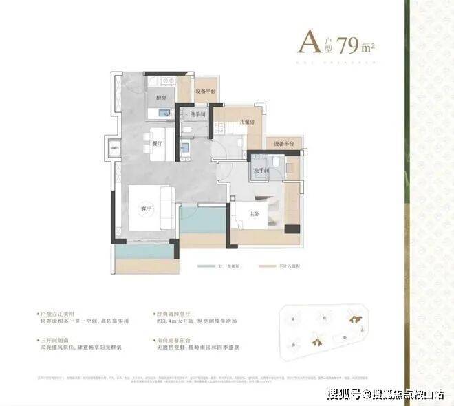 实际使用率(含赠送)在95%左右,相比建筑老规设计,得房率高了10%。79㎡就能做到三房二卫,89㎡能做到四房二卫,99-119㎡四房二卫。