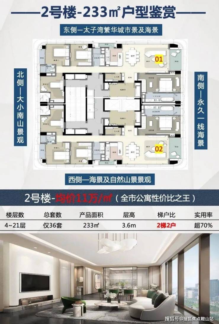 地址:深圳市南山区港湾大道与沁海路交汇处占地面积:0.5㎡总建面:2.3万㎡产权:40年(年)总户数:70户面积:233㎡4+1房3卫,307-309㎡4+1房3厅5卫车位比:127个1:1.8梯户比:3梯2户/2梯2户价格:单价6.9-11万交楼标准:毛坯/精装物业公司:长富物业物业管理费:12.8元/㎡容积率:4.52绿化:22%交楼时间:现楼建筑类型:公寓层高:3.6米使用率:75%楼层高:1单元25层,2单元21层栋数:2栋水电:民水民电商业:自带5万㎡(华润运营)学校:育才二中、育才一小、太子湾学校、深圳湾学校、南外滨海