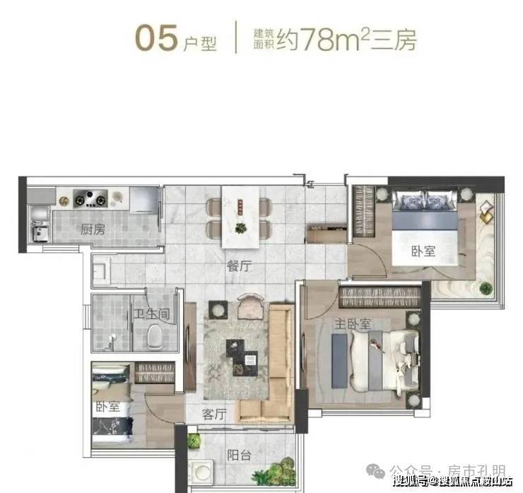 建面78㎡的三房,四个开间朝东南,通风采光俱佳,保证了每一个房间的舒适感。每个卧室皆处于单边位,可较大限度地享受到开阔视野。再加上较高的得房率,可承载一家四口的梦想生活。