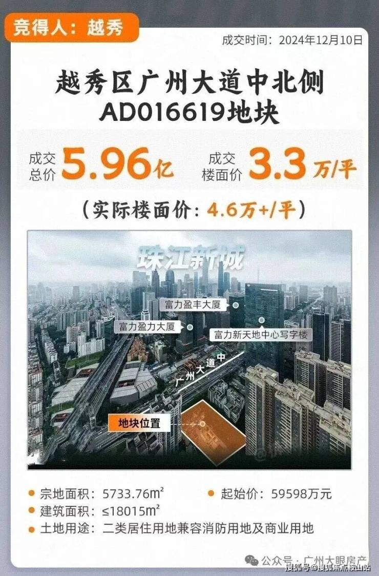 2024年12月越秀地产以59598万总价拿下越秀区广州大道中地块,扣除配建后,楼面价约4.6万/平。