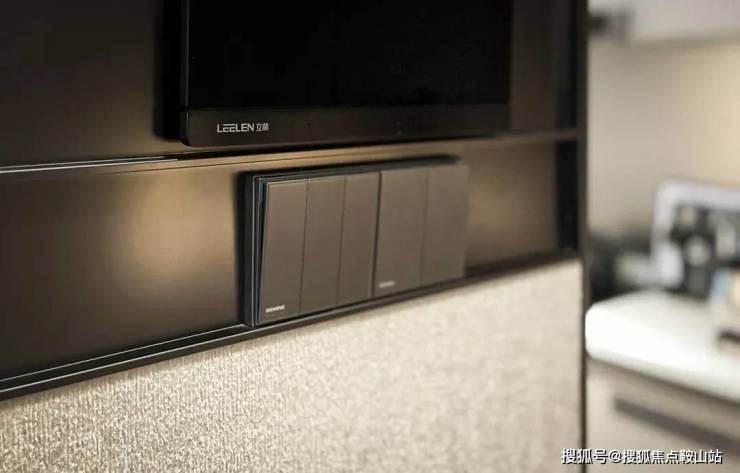 客厅整片的定制岩板背景墙及金属壁龛均为交标