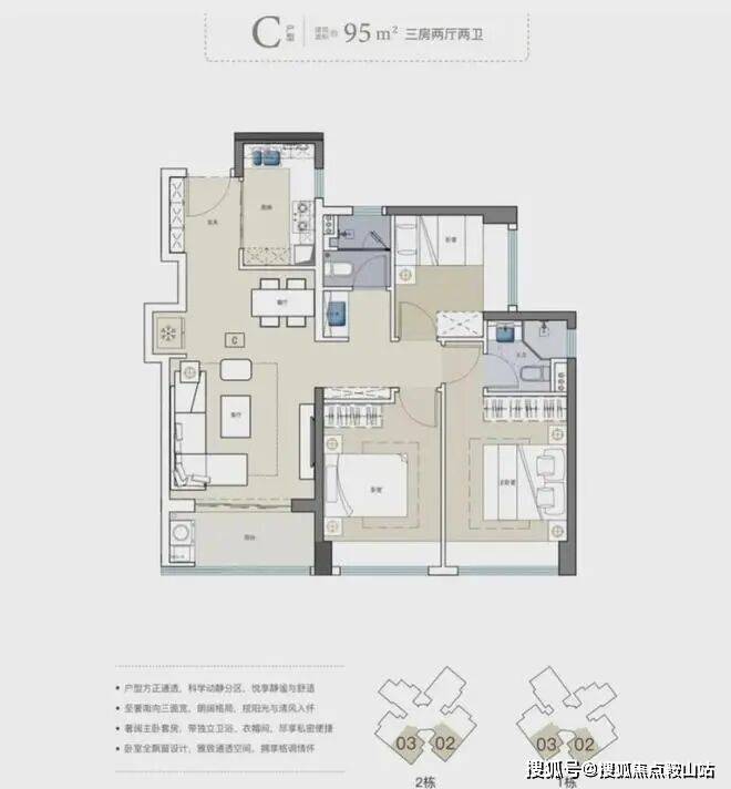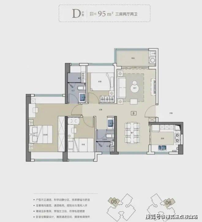 95㎡D户型三房。唯一真正意义上的通透户型,客餐厅纵向分布,动静分离、干湿分离、通风性佳,缺点是其阳台在北侧,日照相对不足。值得注意的是,户型中私密性最好的主卧,同样也实现了南北通透,纵向双面开窗,大尺度观景,清风与鲜氧自由穿梭,居住品质大幅拔高。