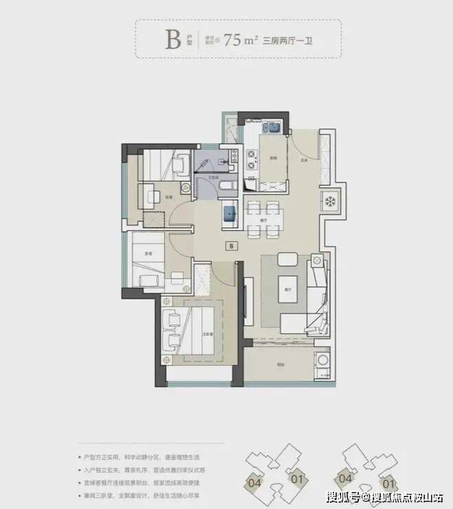 75㎡3房1卫户型。门槛最低的户型,LDKB一体化设计,外接阳台为南向,主卧有同向飘窗,采光通风俱佳,空间利用率也很高。整体设计相对主流,三个卧室面积分布也比较合理,没有为一些不必要的噱头而牺牲实际居住的舒适度。