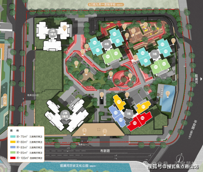该地块有5栋住宅,全部为新规户型,得房率达到了100%-106%,属于该区域唯一新规产品。本次计划首推1栋总45层/3栋/4栋总43层,共3座楼栋,约780套住宅产品,面积有建面约75㎡3房2卫、80㎡3房2卫、83㎡3房2卫、85㎡3房2卫,3房产品共4款不同户型,另有94㎡4房2卫、105㎡4房2卫,层高43层左右,3梯6户设计。
