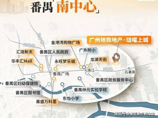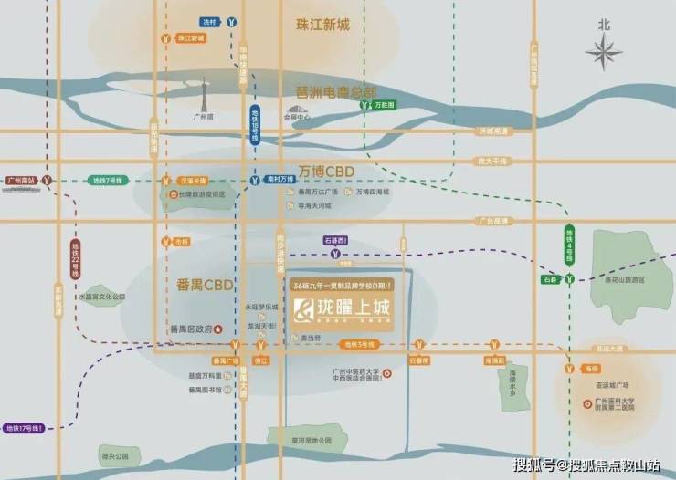 距项目2站的番禺广场,番禺区府所在地,集合番禺的行政、交通、教育、医疗、文化中心,是与北万博平齐的番禺南中心。