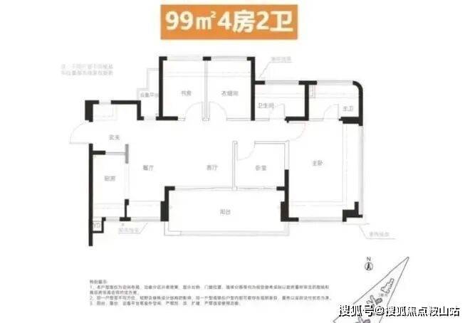 建面约99㎡ 4房2卫:横厅设计,客餐厅开间达5.35米,五开间朝南,主卧大套间,满足二孩或三代同堂的改善需求。