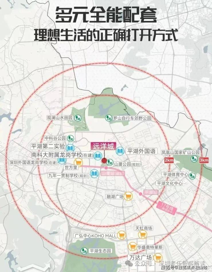 项目自带3所幼儿园,周边5所学校环绕:家门口南科大龙岗附属学校(在建中),1km范围内汇聚深外龙岗学校、平湖外国语、平湖第二实验、九年一贯制学校(规划),真正做到家门口就能满足小孩12年的教育需求!(注:具体以教育局公布为准)