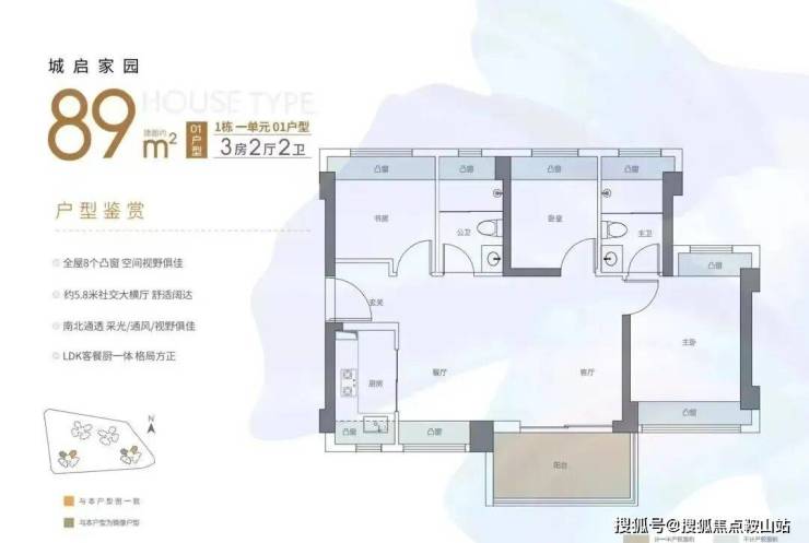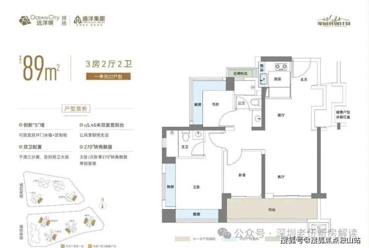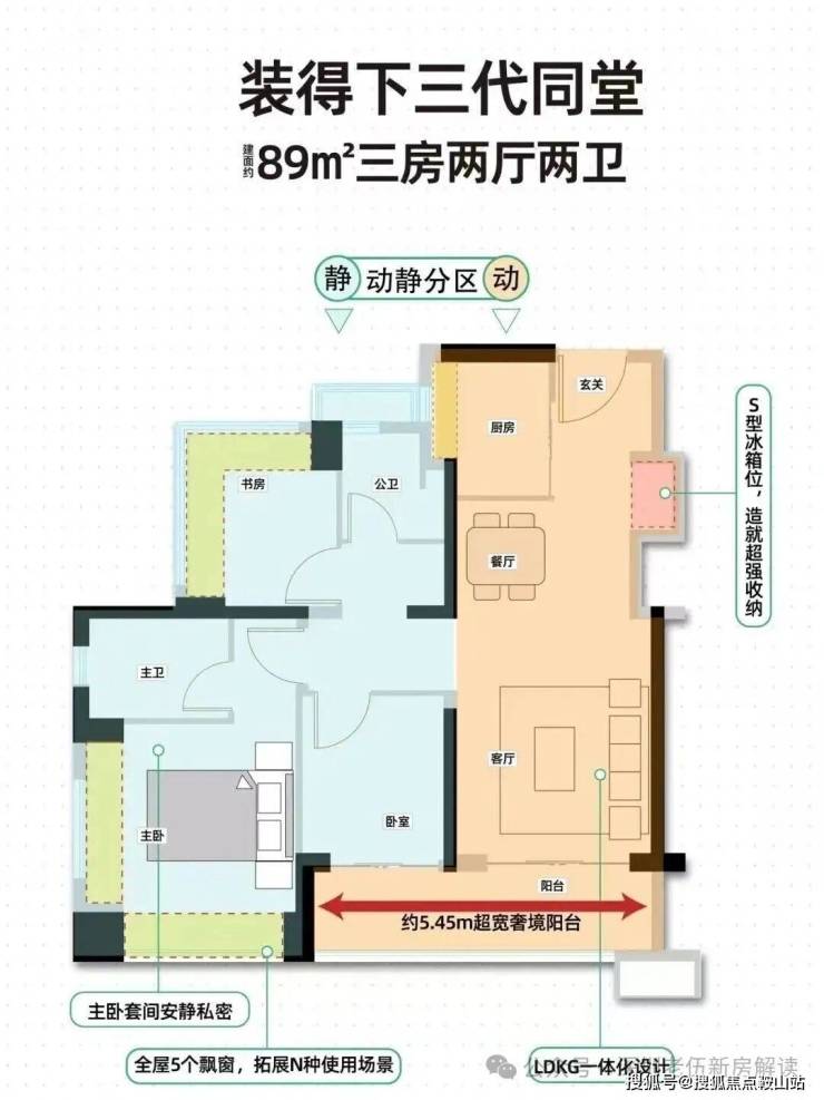 89㎡的3房2厅2卫,02.03户型,设计的是经典竖厅格局,客厅3.4米开间,LDKB一体化,S墙设计预留冰箱卡槽位,动静分区,三开间朝南,3个卧室分别做到了主卧13.79㎡/次卧7.62㎡/次卧6.93㎡(包含墙体飘窗),主卧+1个次卧270°飘窗设计,U型厨房,公卫三段式分离,客厅连接卧室出5.75米长的大阳台,得房率约87.2%(包含赠送),东南朝向。