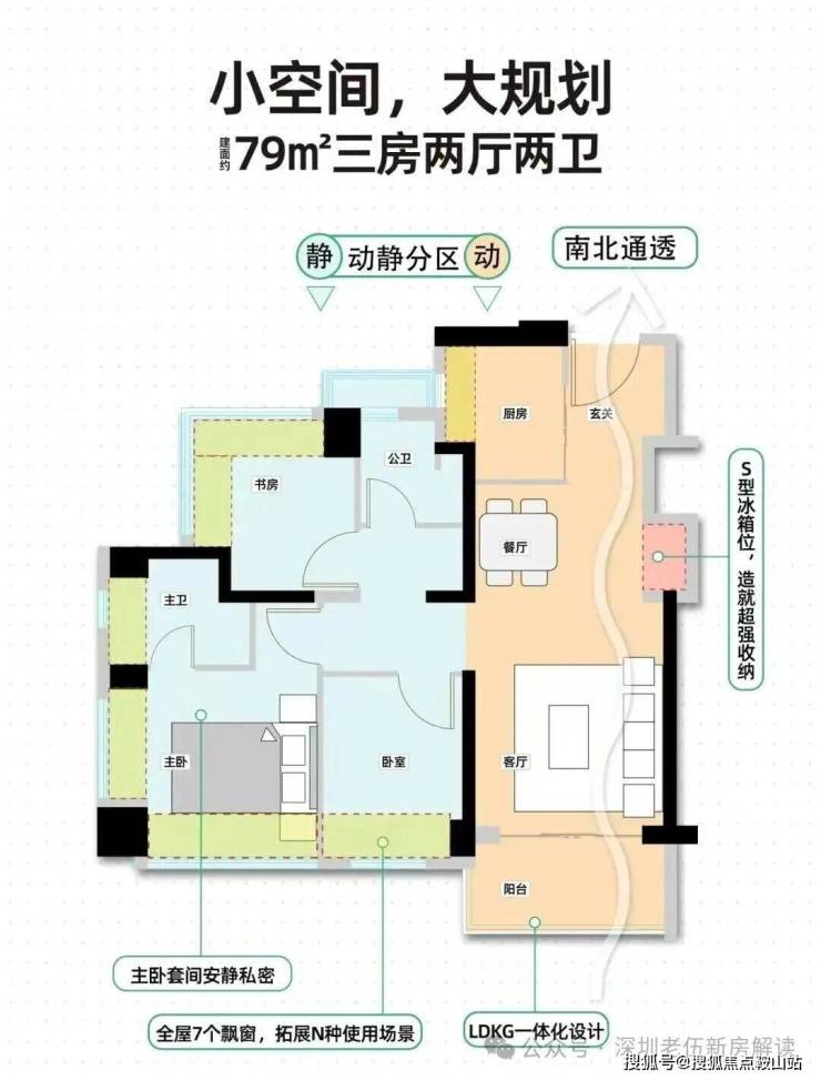 79㎡的3房2厅2卫,设计的是经典竖厅格局,客厅3.3米开间,LDKB一体化,S墙设计预留冰箱卡槽位,动静分区,三开间朝南,3个卧室分别做到了主卧12.1㎡/次卧7.36㎡/次卧6.67㎡(包含墙体飘窗),主卧+1个次卧270°飘窗设计,U型厨房,公卫三段式分离,得房率约88%(包含赠送),东南或西南朝向。