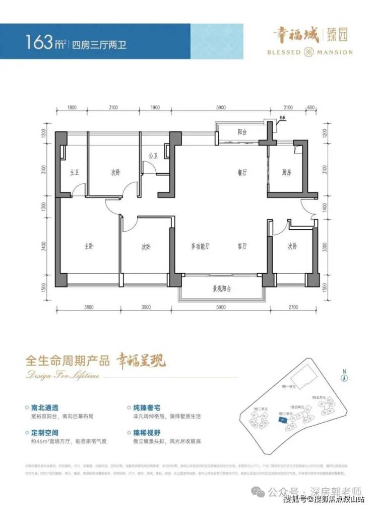 设计的是横厅南北通透格局,进门入户玄关,客厅5.9米开间,餐厨一体化设计,南北双阳台,全屋6个飘窗面,4个卧室分别做到了主卧18.31㎡/次卧12.4㎡/次卧10.15㎡/次卧9.45㎡(包含墙体飘窗),客厅出5.9米长的观景大阳台,U型厨房,公卫三段式分离,得房率约87.1%(包含赠送),阳台主朝东南向。