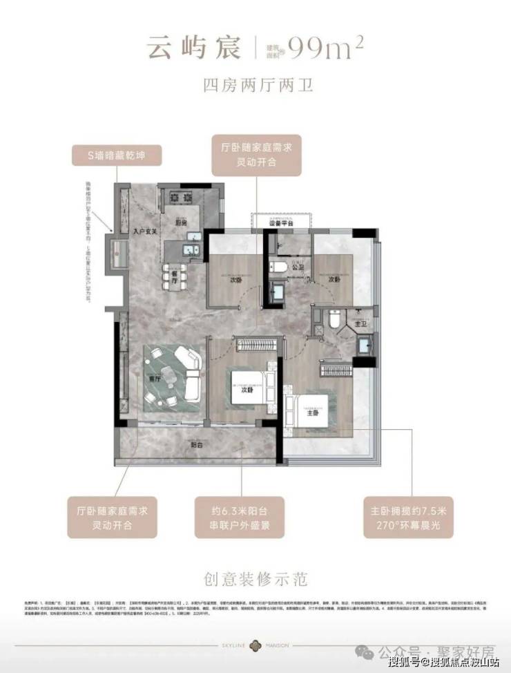 99㎡的4房2厅2卫,设计的是竖厅格局,客厅3.35米开间,LDKB一体化,S墙设计预留双开门冰箱卡槽位,三开间朝南,动静分区,U型厨房,公卫三段式干湿分离,赠送设备平台,得房率约78.27%(不含赠送),客厅连接次卧出9.37m²大阳台西南或东南朝向。靓点:99平做到了4房2卫,主卧270°无柱转角飘窗,厨房烟道外置+额外赠送设备平台,并且是纯南向格局。