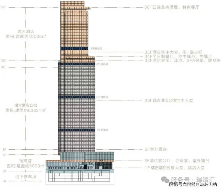项目总占地约7700㎡,建筑面积约10.7万㎡,其中包含了约4万㎡瑞吉酒店、6.2万㎡企业会馆瑞湾府以及5000㎡瑞湾荟商业,是一个集企业会馆、五星级奢华酒店、精致商业于一体的垂直综合体。