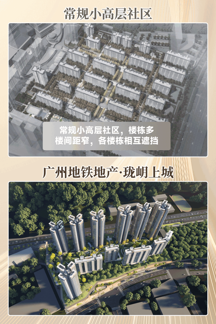 项目一期建面共11万平,由7栋塔楼总高32层,以及4栋小高层板楼总高16层组成,全部非超高层,其中塔楼均为两梯三户与两梯四户、板楼为两梯两户,密度低,这在老黄埔相对少见,让不喜欢超高层的客户有了选择。