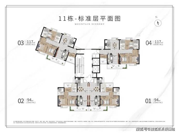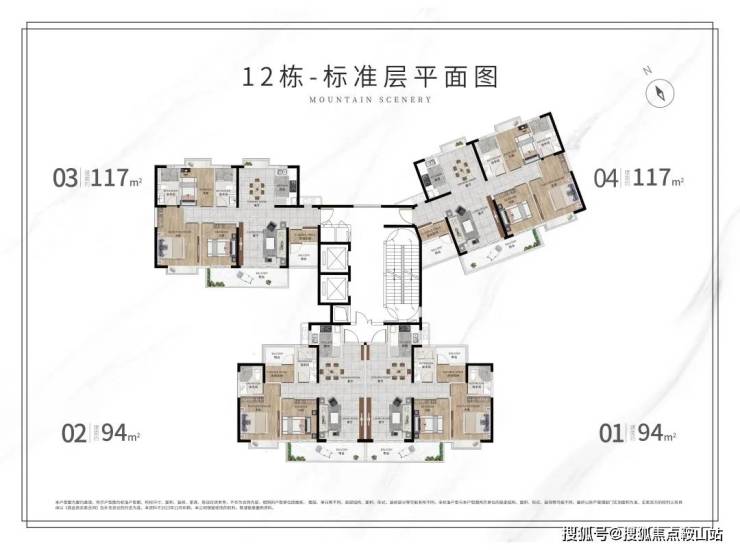 以山景为依托,半围合式布局,每一栋高层朝向皆不同,前后无遮挡,每一户的景色都是独一无二。