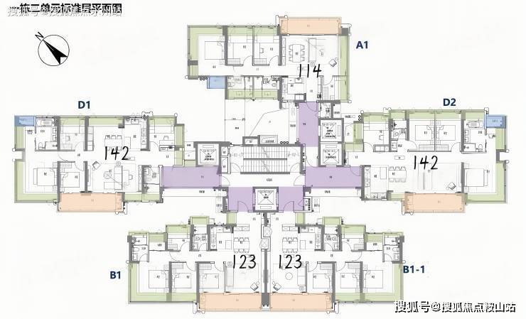 4梯5户带独立电梯厅,面积为114-122-138-143㎡,最大使用率108%,最大赠送面积接近44㎡。