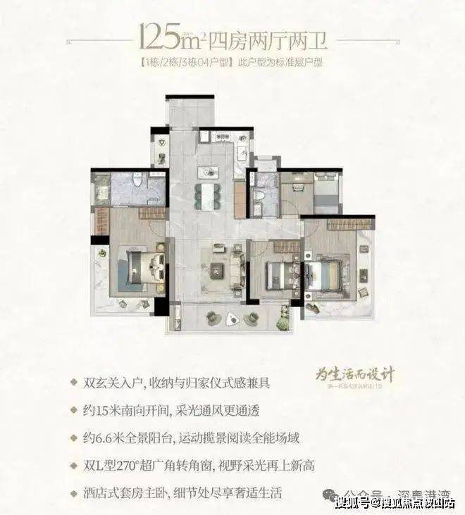 且配备双玄关入户、双阳台、 270°观景飘窗等配置。