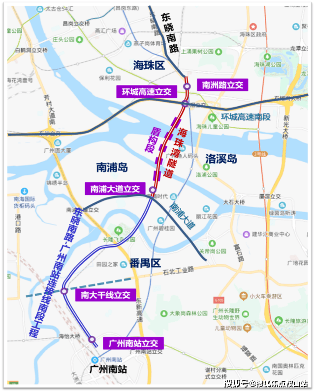 东晓南放射线,东晓南路至广州南站连接线全长约9.5公里,路线整体呈南北走向,由南段工程和北段工程组成,意义在于加强广州主城区与广州南站的直接联系;采用城市快速路标准,双向六车道,设计速度为80公里/时。