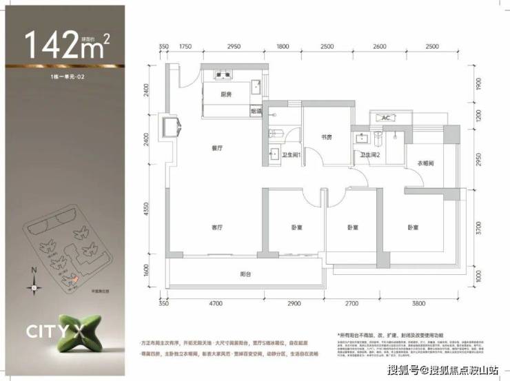 142平米(4+1房)户型优势:1、东南朝向前排无遮挡直接看河西公园,高层可以看湖。2、客厅4.7米开间。次卧和客厅阳台连接,阳台7.6米长。3、户型稀缺,小区142平只有52套。