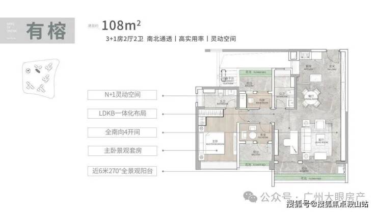 建面108平3+1房,四开间朝南,近6米的南向阳台,270度景观,LDKB一体化设计,5.9米的大方厅,奢阔大主套设计,配置南向大飘窗,独立卫浴,L型衣帽间