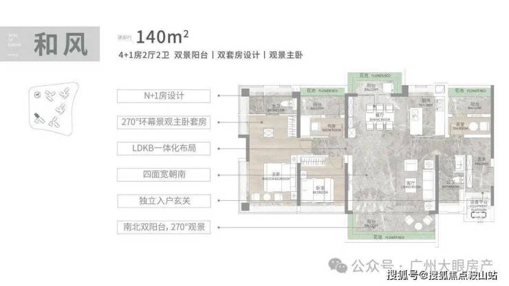 建面140平4+1房,同样四开间朝南,南向采光面达到了15.7米,南北双阳台,LDKB一体化设计,主套配置270度折叠屏飘窗