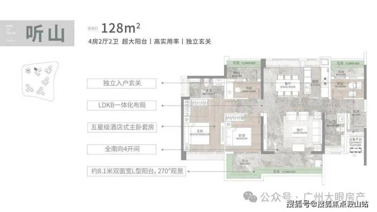建面128平四房,L型独立玄关,还做了8米的L型阳台,四开间朝南,餐厅也打造了全景飘窗,实现南北对流