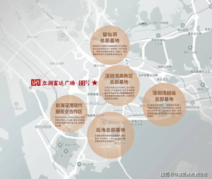 中国科创看深圳,深圳科创看南山,深圳市6+1总部基地,南山区独占4+1,项目毗邻深圳湾高新区总部基地,前海合作区,后海、深圳湾、留仙洞总部基地环绕,战略高地围合,智领深圳价值中芯